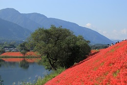 毎年秋、津屋川の堤防沿いには、およそ3kmに渡って約10万本の彼岸花が咲き誇ります。